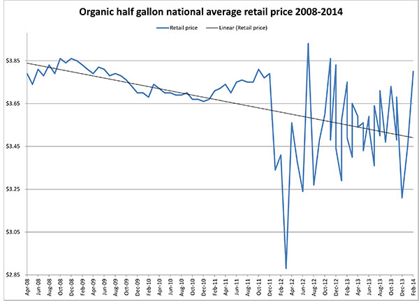 Comparing the share of the dollar that organic producers are left with to the non-organic share is complicated by a different pricing structure. There is a greater range of prices for organic than in non-organic. On the lower end, there is the retail price of store brand product which can be as low as $2.50 per ½ gallon (two ½ gallons for $5). There are also in-store promotions for set periods of time to encourage sales in competitive markets where ½ gallons have been as low as $2.40 per ½ gallon. For the majority of stores, the retail price of branded product will be between $3.50 to $4.99 per ½ gallon, with the higher prices found in the Northeast and the lowest in the Northwest. The higher price for branded organic ½ gallons is approximately $4.99 which would be found in areas with a lower volume of sales of organic, poor distribution, or no competition.