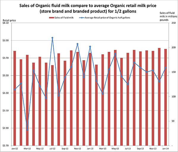 USDA Agricultural Marketing Service reports Organic Whole Milk sales seeing the biggest growth in January 2014; an increase of 13.5% over January 2013. The weighted average advertised price of organic milk half gallons is $3.60 One year ago the weighted average advertised price was $3.59The organic-conventional half-gallon price spread is $2.07, despite the high price for conventional Class 1 fluid milk which is running at $26.9 per hundred pounds in the Northeast Federal Milk Marketing Order.