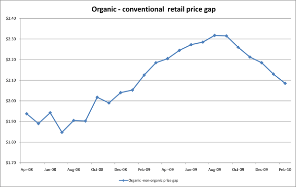 With the rebound of the non-organic market the price gap between organic and non organic retail pricing has decreased, down from a high of $2.32 in August to $2.09 in December 2009 which will make organic milk more attractive to price conscious consumers.