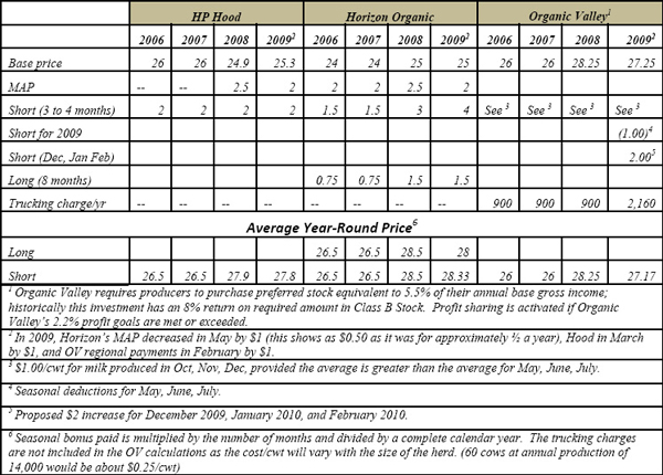 ADDED March 9, 2010. The full effect of the downturn in demand for organic dairy is being felt by all producers, with no one under the illusion that the situation will improve quickly. Consumer demand is still slightly negative but stable, although there are regional and seasonal fluctuations in sales of fluid milk on a monthly basis; there are only two national buyers for wholesale organic milk; many producers are on short contracts; pay price has dropped; smaller independent handlers and cooperatives are making difficult decisions about their future; and the 270 + producers who shipped to HP Hood/Kemp/DMS to supply the milk for the Stonyfield fluid milk brand are in an uncertain position. Many well established organic dairies that have a good history of working with their processor will have a reasonable year financially but there will be many that have to make difficult personal and professional choices with limited options in 2010. The principal challenges for organic dairy are to manage supply, based on modest and reasonable growth and to balance production by growing a diverse number of organic dairy products rather than relying on the non-organic market to balance any surplus.