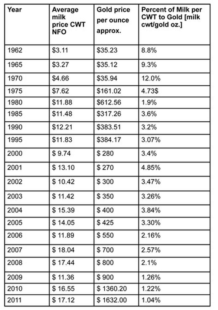 In the year 2000 NFO's yearly Class III conventional milk averaged $9.74 cwt. and gold for that year averaged $280.00. The milk price is 3.4% of the gold price or it takes over 2874# of milk to buy 1 oz. of gold. Today, January 10, 2012 at 3:00 pm at dairy.com the milk price is $17.12 and gold at kitco.com is $1632.00. Our milk price is 1.04% of the gold price or it takes 9,533 lbs. to purchase 1 oz. of gold. That is over 3 times the rate exchange that existed in year 2000. That is over 3 times more milk to buy the same amount of gold. If our milk was the same percentage of gold as it was in year 2000, we would be getting over $50.00 cwt. What has changed? The gold content is the same 1 oz. and the milk content is the same 100 lbs. It is the purchasing power of the dollar. The dollar is more worthless today than it was in year 2000. In fact, it buys over 78% less than it did in year 2000. This seems to be called monetary Inflation, or someone has printed too many dollars with nothing to back the dollars like a solid commodity as gold.