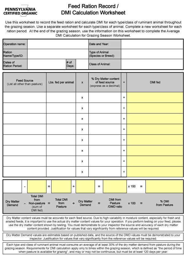 Most certifiers have now developed simple worksheets and spreadsheets that can be used to determine DMI from pasture using the subtraction method; subtracting what is fed in the barn from the total Dry matter demand of the cow based on size, breed, and production level. Ask for help, it is available from many sources. The accompanying worksheet from PCO is the one I am most familiar with in doing their pasture training workshops. Each separate component of the feed ration, like dry hay, corn silage, baleage, grain mix, etc. can be listed separately, so the total Dry matter from non-pasture sources can be calculated. If you are not sure of the dry matter content of feedstuffs, use standard book values, ask your feed supplier or nutritionist, or run a test on a sample yourself. Ensiled feeds tend to have the most variability and unpredictability, so make sure to get that one right.