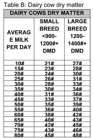 Then use Tables B and C to figure out the Dry Matter Demand per animal per day. Tables B and C are used by MOSA (Midwest Organic Services Association) to predict DMD of dairy cows based on size and level of milk production. These tables predict DMD based on the current weight of the animal and/or how much milk they produce.