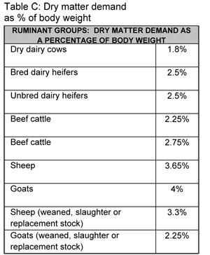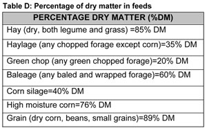 To get the pounds of Dry Matter Demand for dry cows, for instance, take the weight of the animal times the % from Table C and multiply (1200 pounds x 1.8% or 0.18= 21.6 pounds DMD).