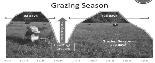 The grazing season will vary from 365 days to 120 days, depending on the location of the farm. The grazing season may be interrupted or non continuous in some parts of the country. The actual length of the grazing season for a given farm can be determined based upon historical documentation of grazing days on the farm.