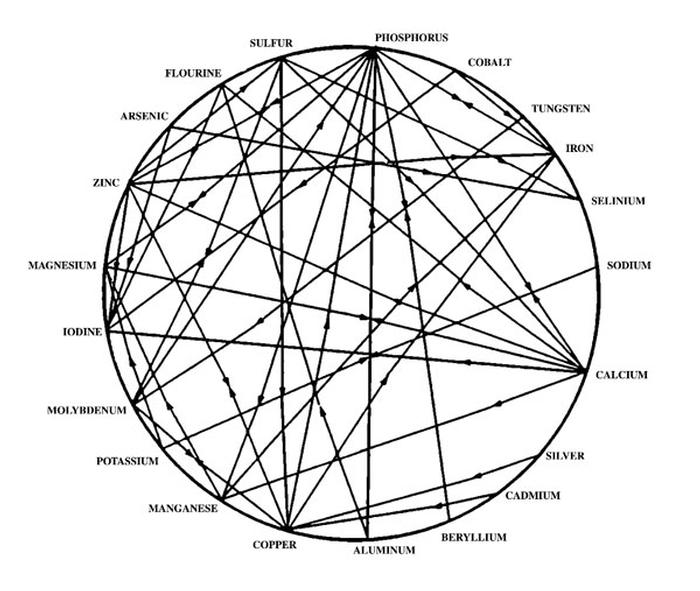 The mineral wheel provided in the illustration shows the lovely inter-relationships and influences between minerals and nutrients. One can see how the excess or lack, be they absolute or functional (eg “tied up by another mineral”), of any individual mineral greatly influences other minerals in the ecology.