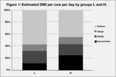 The concentrate used for supplementation was equal parts rolled corn and rolled barley and fed twice daily at the time of milking so that intake could be closely monitored. Daily DMI estimate was based off 4% of the herd average cow weight (1100 pounds) amounting to an average estimated DMI of 44 pounds per cow per day. The amounts of DMI from the alfalfa, winter mix silage, and concentrate were subtracted from the total estimated DMI to reach the estimated pasture consumption for group L of 25.32 pounds DM (58% of total DMI) and of 20.04 pounds DM (46% of total DMI) for group H. Both groups had a smorgasbord of mineral choices available to them at all times including macrominerals, kelp and trace minerals.