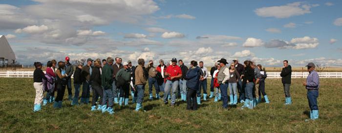 Then we moved out for a look at the pastures, because that was the big question -- can they meet the grazing requirements? On the day we arrived, one group was moving out to pasture when we pulled up in the buses, and another group was let out to the pasture adjacent to the barn part way through the tour.The remainder of the cows were already out on pasture. According to the Horizon staff, there is about 4000 acres of pasture, of those 1700 are native pasture and 2300 irrigated. To get there, the cows walk a maximum of 1 1/2 miles to the farthest paddocks. The pastures we walked through had just been grazed and were permanent pastures with established perennials. In the view of most of farmers that toured the farm, the Horizon team has very similar problems to the rest of us in how to balance a ration on pasture that provides enough energy to maintain body condition while ensuring that production and breeding schedules are maintained. This has been complicated this year for the Horizon farm team by the need to control supply. All the pastures have to be irrigated, except for the native pasture that can be grazed for about 30 days in the spring depending on moisture and temperature. Jerry Brunetti (who arrived for a brief appearance during the tour) has been working with farm staff on soil balancing and crop rotations.