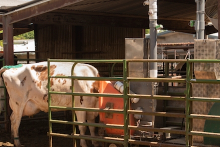 “The molasses masks the smell,” Kebreab said, smiling as two Holsteins nudged a gate that opens when it’s time for their next meal. “They enjoy their feed.”