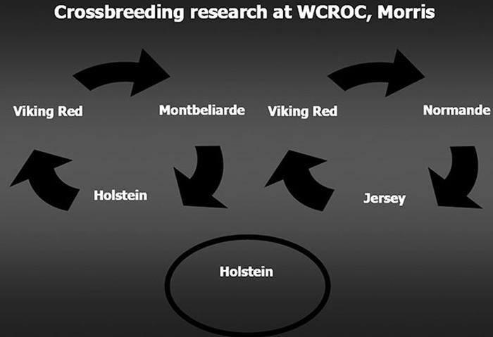At the organic dairy in Morris, we have developed two crossbreeding designs and are comparing them to Holstein herdmates. In one 3-breed rotation, we are using the Holstein, Montbéliarde, and Viking Red breeds (ProCROSS). The other 3-breed rotation uses the Viking Red, Jersey, and Normande breeds (no Holstein in the rotation). The accompanying figure (at left) provides the 3-breed rotation schemes for our dairy herd.
